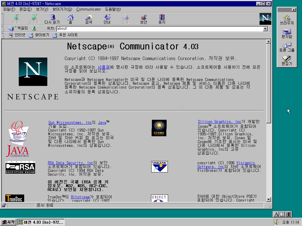 한때 인터넷 브라우저계를 주름잡았지만 인터넷 익스플로러에 밀려 묻히고 만 비운의 브라우저인 넷스케이프 커뮤니케이터 4.03 한글판입니다. 14.4MB 디스크 이미지 파일입니다.