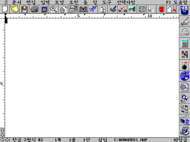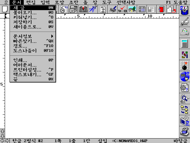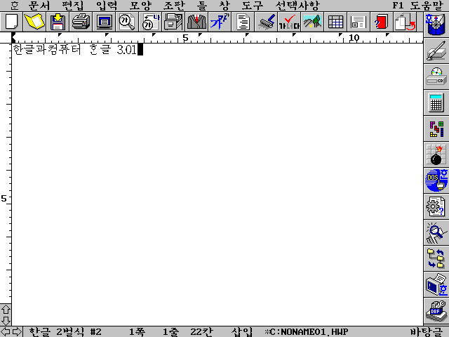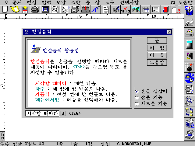 한글 3.01이 실행되었습니다. 한글 3.0과 마찬가지로 한걸음씩 도움말이 나옵니다.