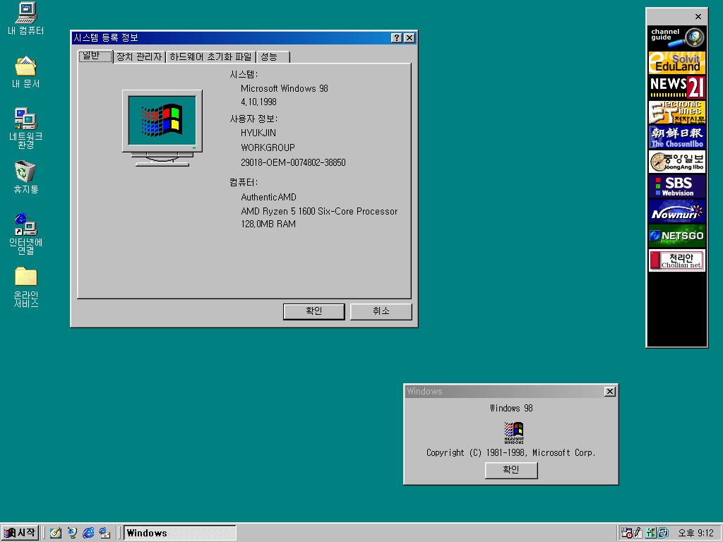 시스템 등록 정보창입니다. 윈도우 98입니다. 빌드 넘버는 4.10.1998입니다.