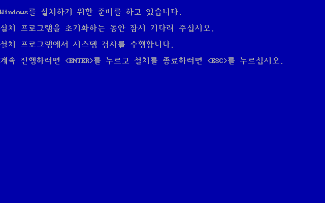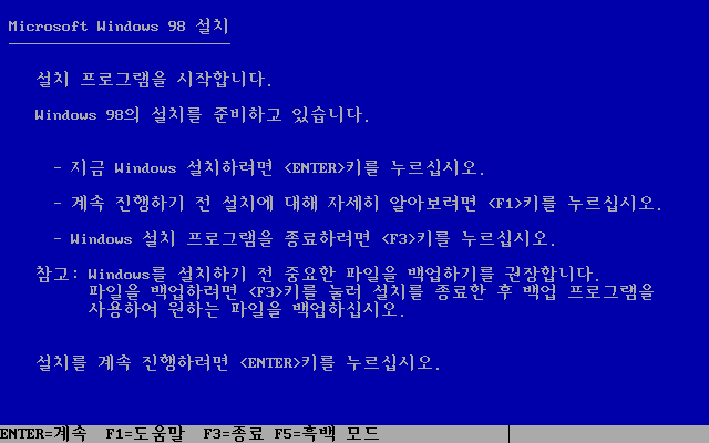 윈도우 98 설치를 시작합니다. 엔터를 누릅니다.
