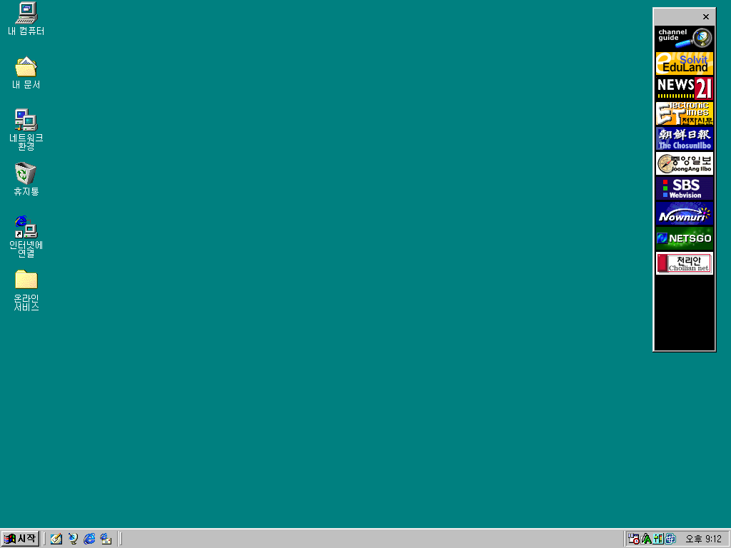 그래픽 드라이버를 설치한 후의 모습입니다. 스크린샷은 기본 배경화면이지만, IE 4.0이기 때문에 액티브 데스크톱을 기본적으로 탑재하고 있고, 작업 표시줄엔 빠른 실행 아이콘이 보입니다. 또한 바탕화면 우측에는 그 시절의 인터넷 채널바가 있습니다. 나우누리, 넷츠고, 천리안.. 참 오랜만에 들어보는 이름이네요 ㅋㅋㅋ