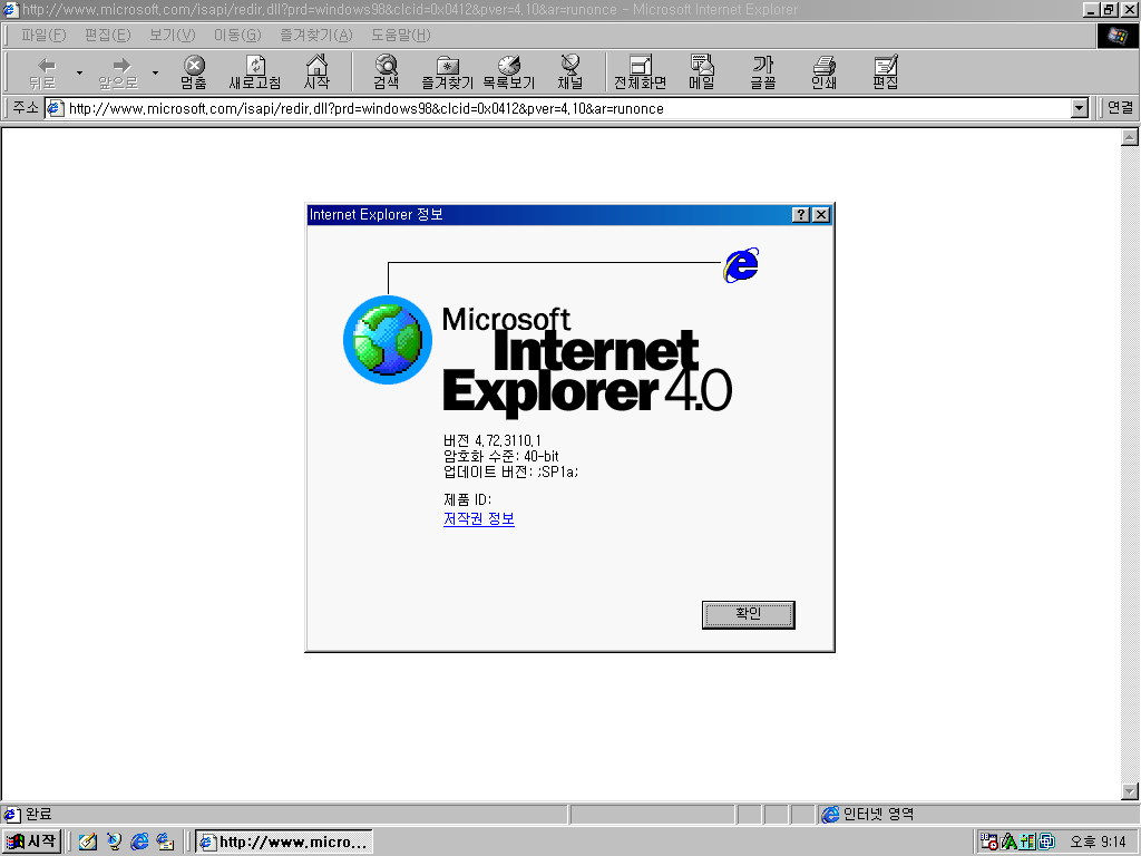 인터넷 익스플로러입니다. 버전 4.01입니다. 빌드 넘버는 4.72.3110.1입니다. 윈도우 98은 IE 6까지 지원합니다.