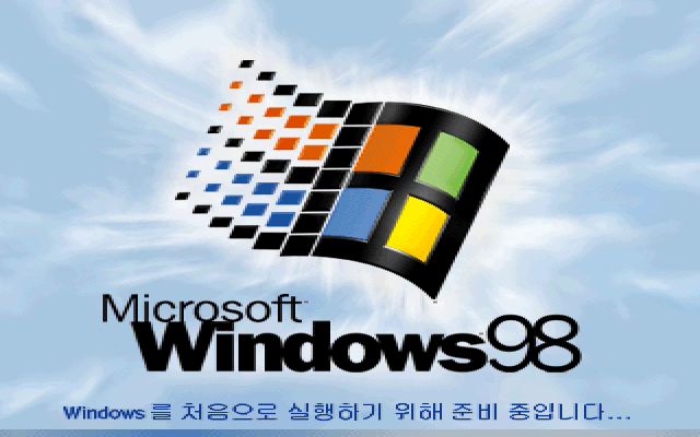윈도우 98의 부팅화면입니다. 윈도우 95와 비슷한 하늘 배경이지만, 윈도우 로고 중심에서 무언가가 퍼져나오는.. 그런 느낌입니다. 밑에는 물결 무늬가 흘러갑니다.