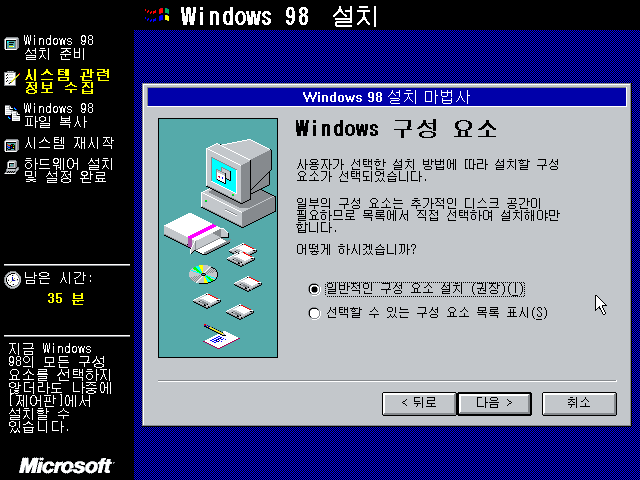 설치할 윈도우 구성 요소를 선택합니다. 일반적인 구성 요소 설치를 선택합니다.