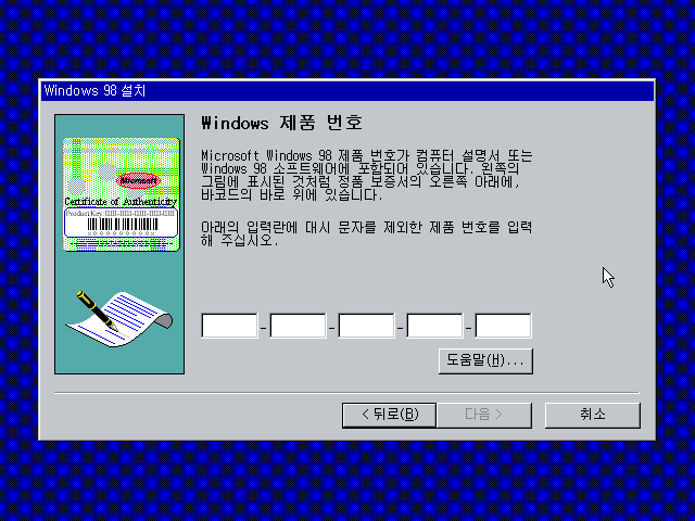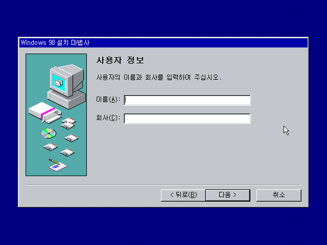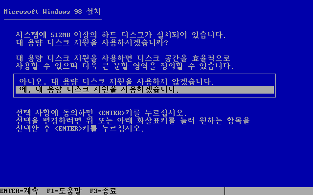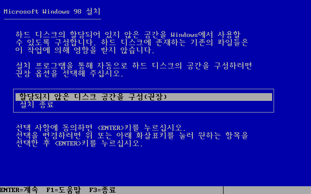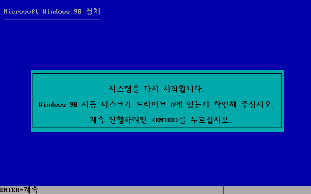 윈도우 98 설치를 시작합니다. 엔터를 누릅니다.