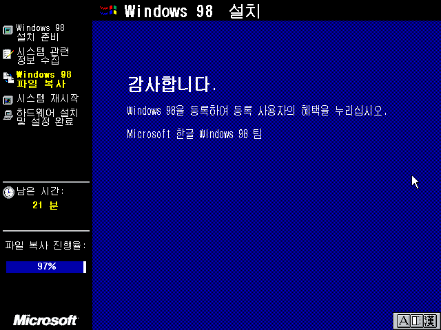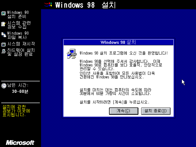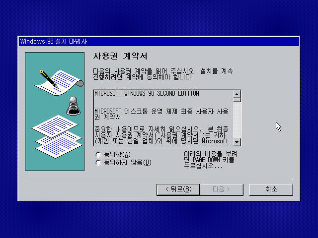 Windows 98 Second Edition을 설치해보았습니다. 윈도우 98 SE는 윈도우 98의 후속작으로, 대규모 업그레이드 버전입니다. 인터넷 익스플로러 5와 미디어 플레이어 6.1을 탑재하여 인터넷과 멀티미디어 기능을 강화했습니다. 이때는 9x는 가정용, NT는 회사나 서버용이라는 인식이 강했고, 98 SE의 후속작이었던 윈도우 Me가 처참하게 망했기 때문에, 윈도우 98 SE는 오랫동안 가정용 컴퓨터의 운영체제로 자리를 잡게 되었습니다.