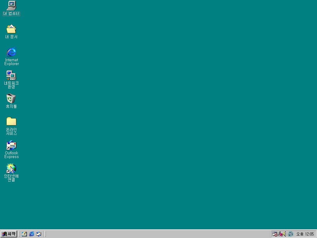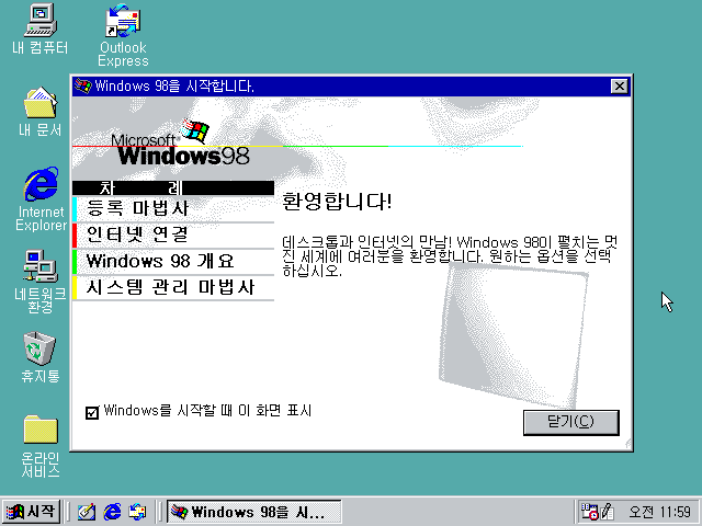 그래픽 드라이버를 설치한 후의 모습입니다. 윈도우 98 오리지널과 다른 점은 IE가 5.0이기 때문에, 4.0에서 선보였던 채널바는 사라졌습니다. 그 외에는 별 다를게 없습니다.