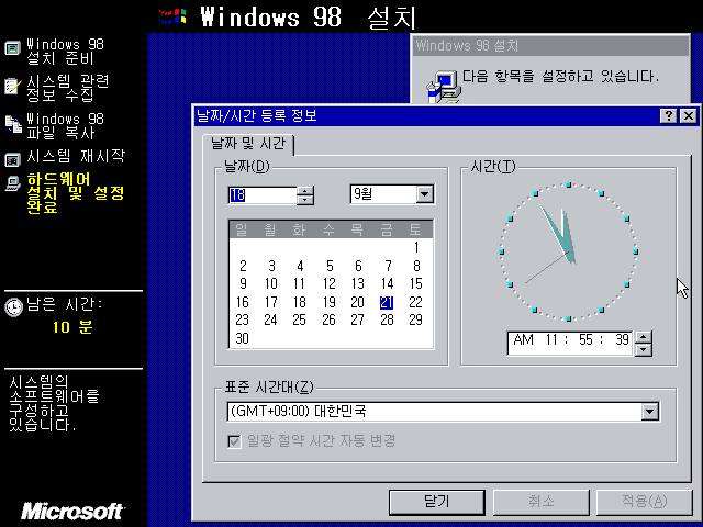 재시작 후 여러 항목을 설정합니다. 시간이 맞는지 확인 후 닫기를 누릅니다.