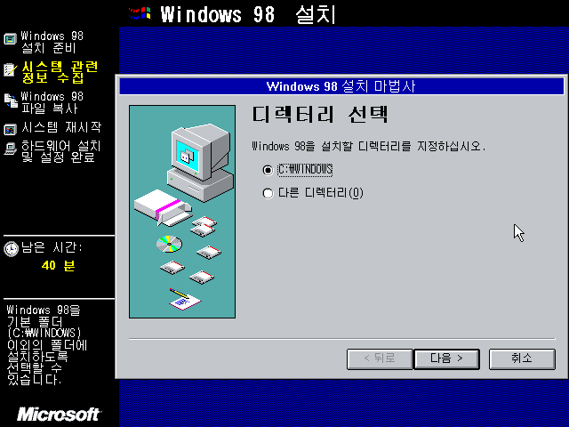 윈도우를 설치할 디렉토리를 선택합니다. C:\WINDOWS를 선택합니다.