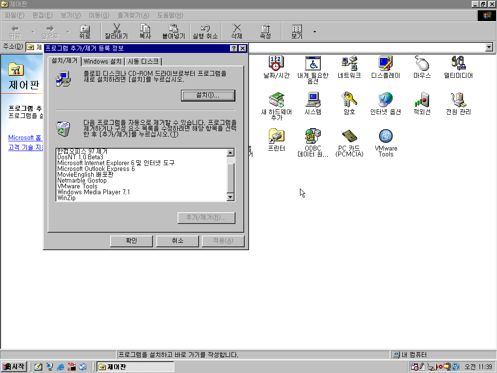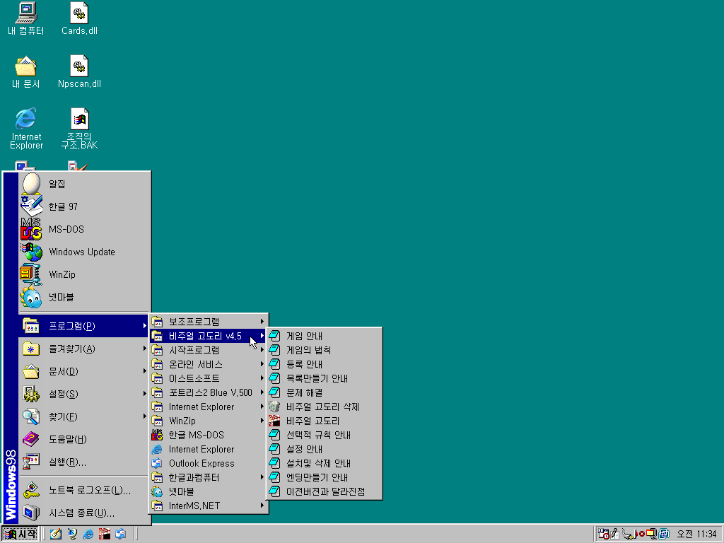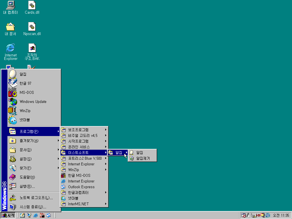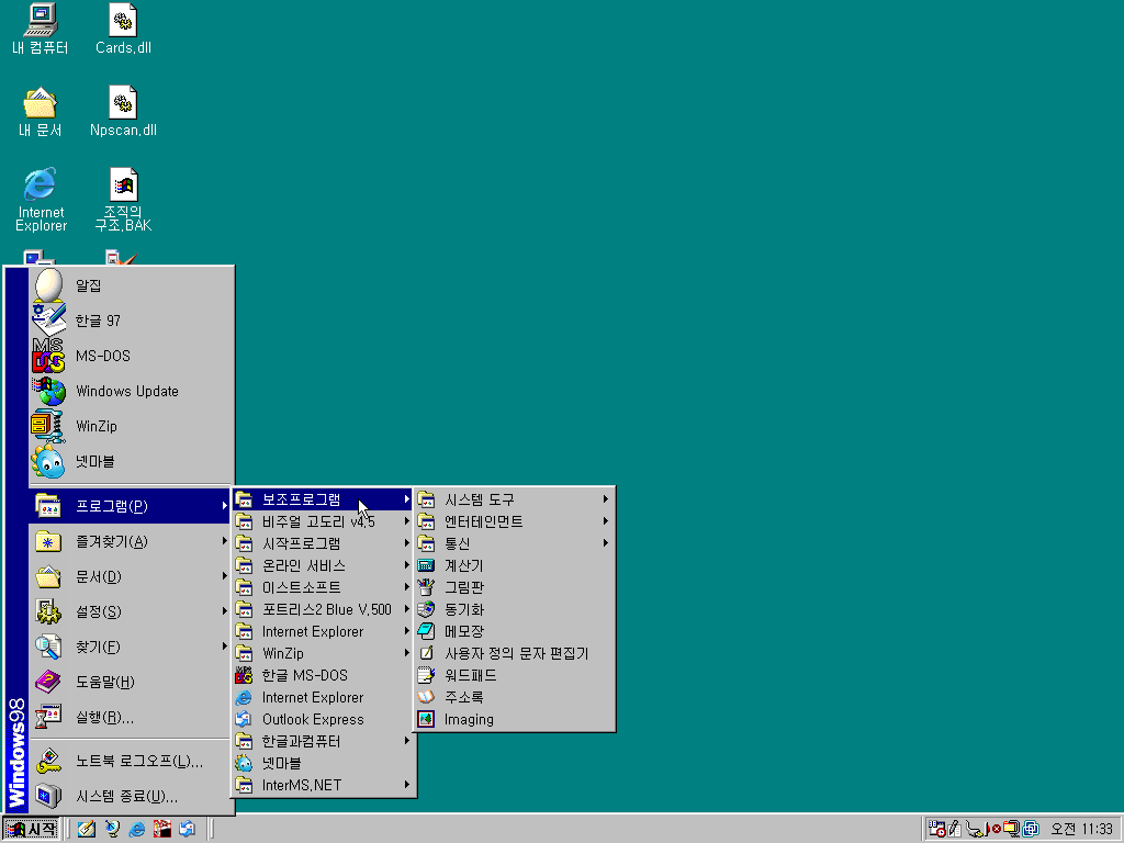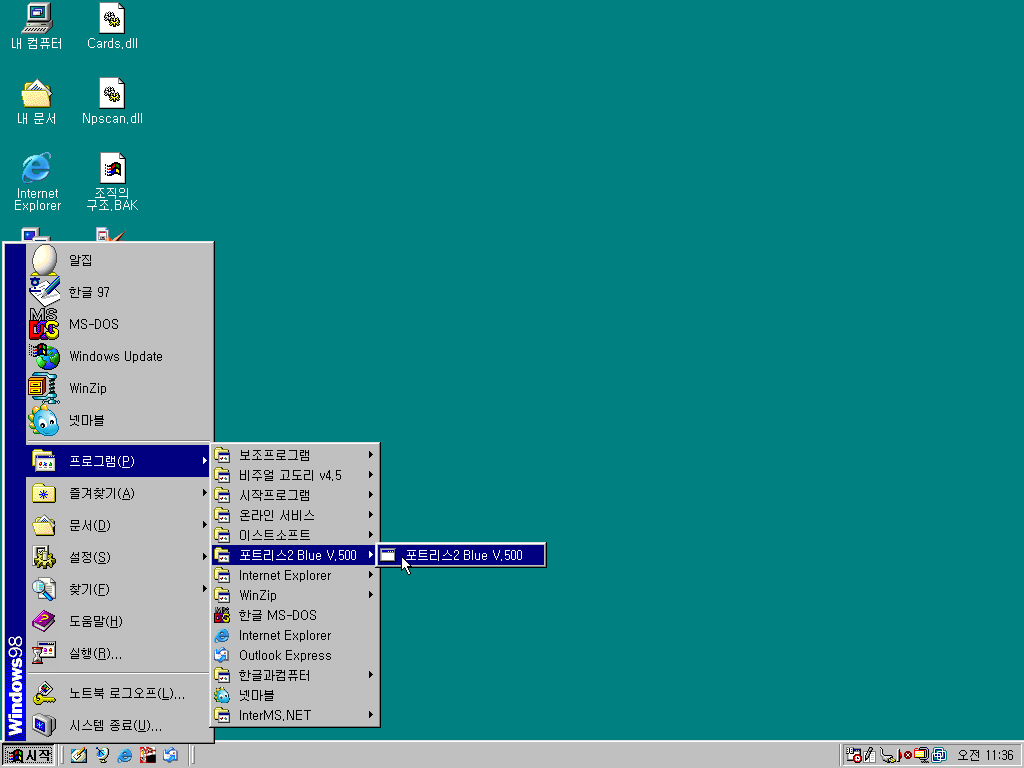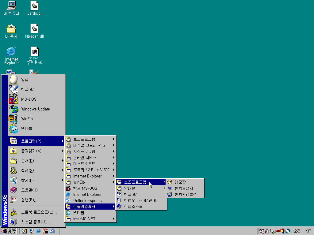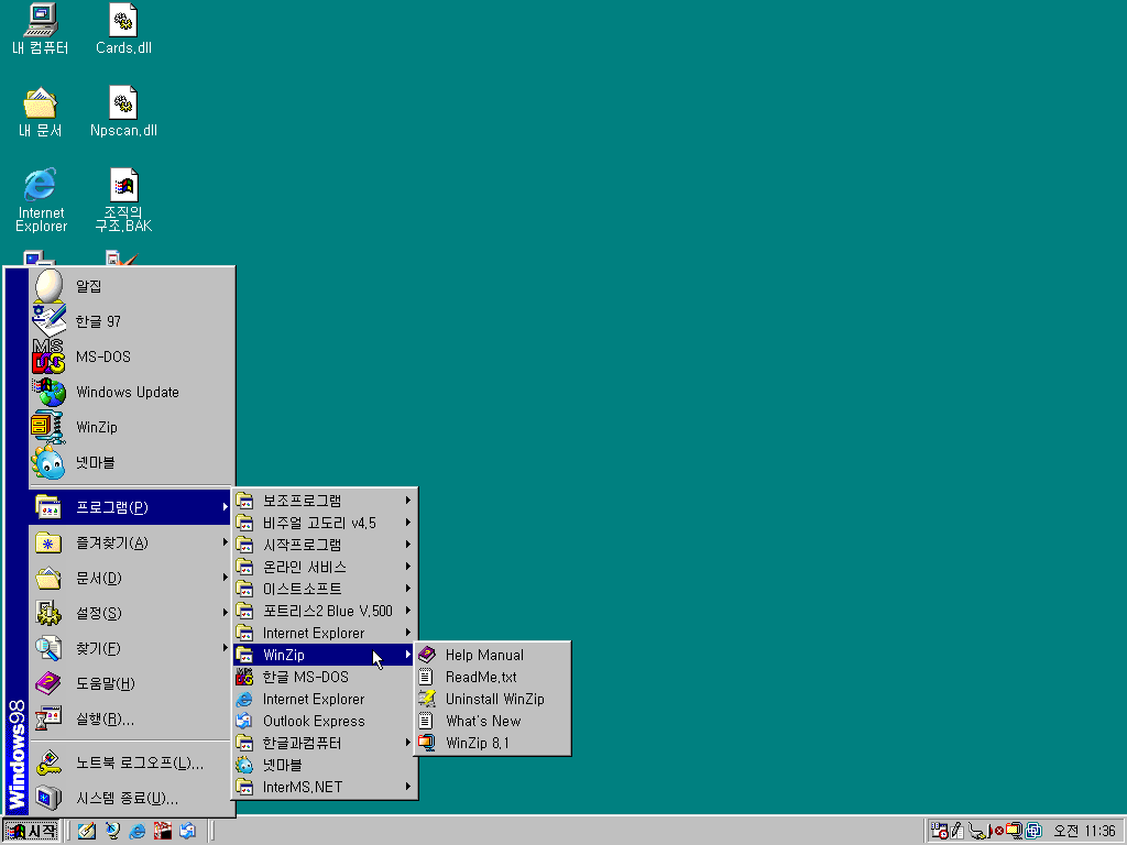 시작 메뉴를 열어보았습니다. 노트북 출신 답게 노트북 로그오프라고 나옵니다. 비주얼 고도리 4.5, 알집, 포트리스 2, WinZip, 한글 97, 넷마블까지... 정말 추억의 프로그램들입니다.