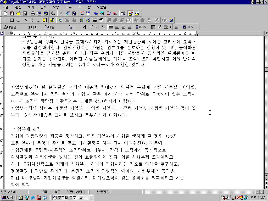 바탕화면에 있던 조직의 구조.hwp 문서를 열어보았습니다. 전 주인분께서 작성하던 문서 같습니다.