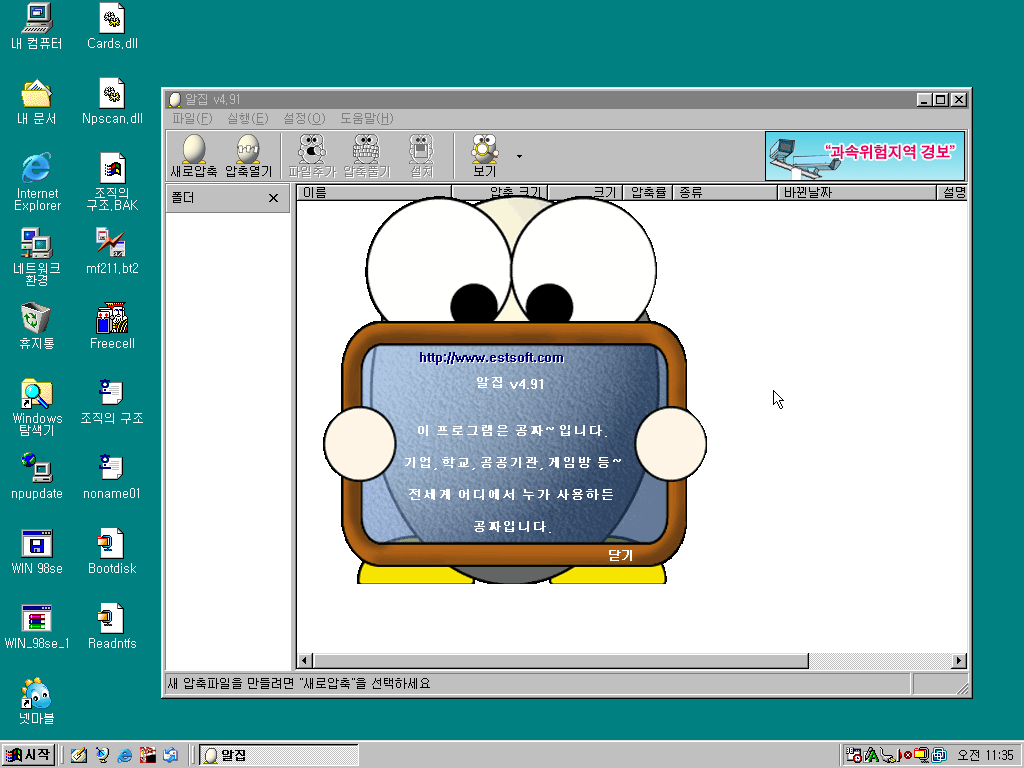 알집 4.91 버전입니다. 정말 옛날 버전이네요. 이 시절 알집은 이렇게 버전 정보창에 개발자가 직접 썼을법한 문구가 나왔었죠. 공짜입니다~ 이런식으로요 ㅋㅋㅋ