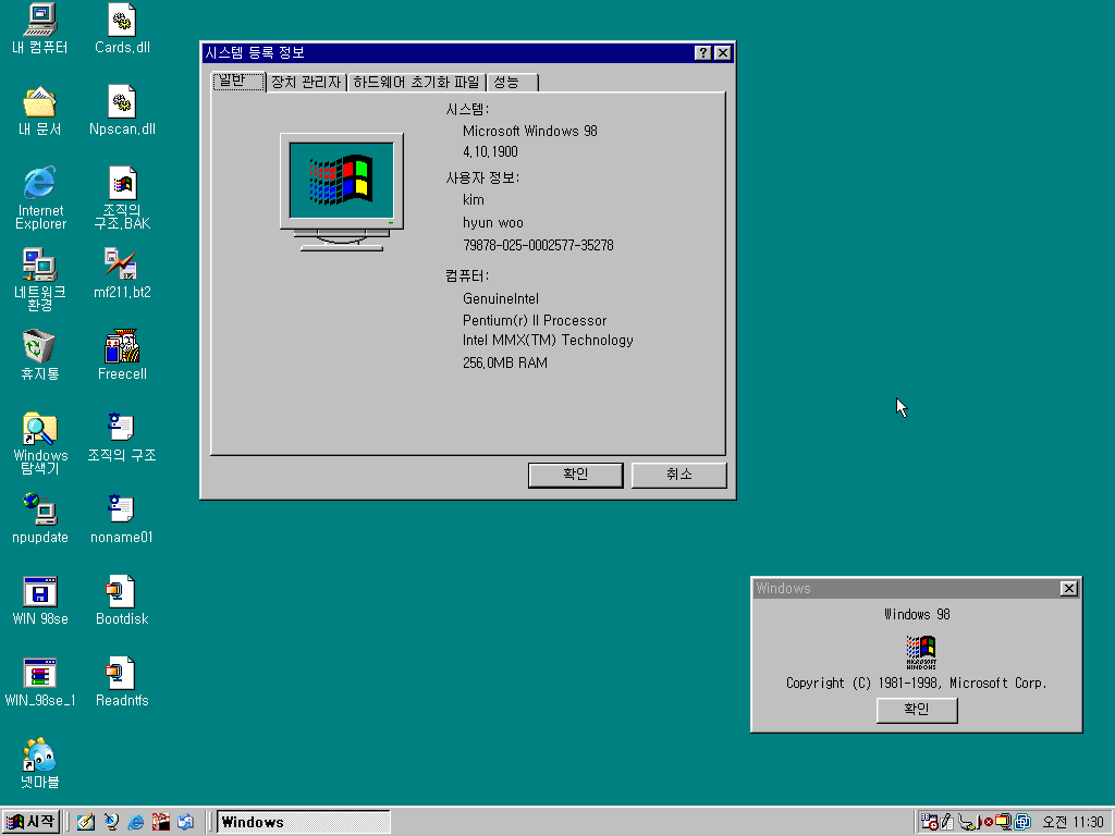 시스템 등록 정보입니다. 윈도우 98, 빌드 넘버는 4.10.1900입니다. 정식판 빌드가 1998이니 거의 개발이 완료되어갈 때의 RC3 빌드입니다. 사용자 정보를 보니 김현우라는 분이 사용하던 노트북 같습니다. 참고로 빌드 1900은 한글판은 RC3인데 영문판은 RC4인 참 요상한 버전입니다.
