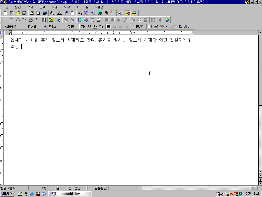 바탕화면의 noname01.hwp 문서도 열어보았습니다. 21세기 사회를 흔히 정보화 시대라고 한다. 로 시작하는, 작성하다 만 문서였습니다. 정보화 시대.. 어렸을 때 참 많이 듣던 말이었죠. 이 문서를 작성할 때는 아직 20세기였을 겁니다.