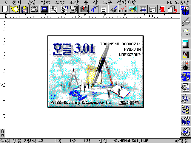 한글과컴퓨터 한글 3.01입니다. 67.8MB 디스크 이미지 한 장과 시리얼 번호가 들어있습니다.