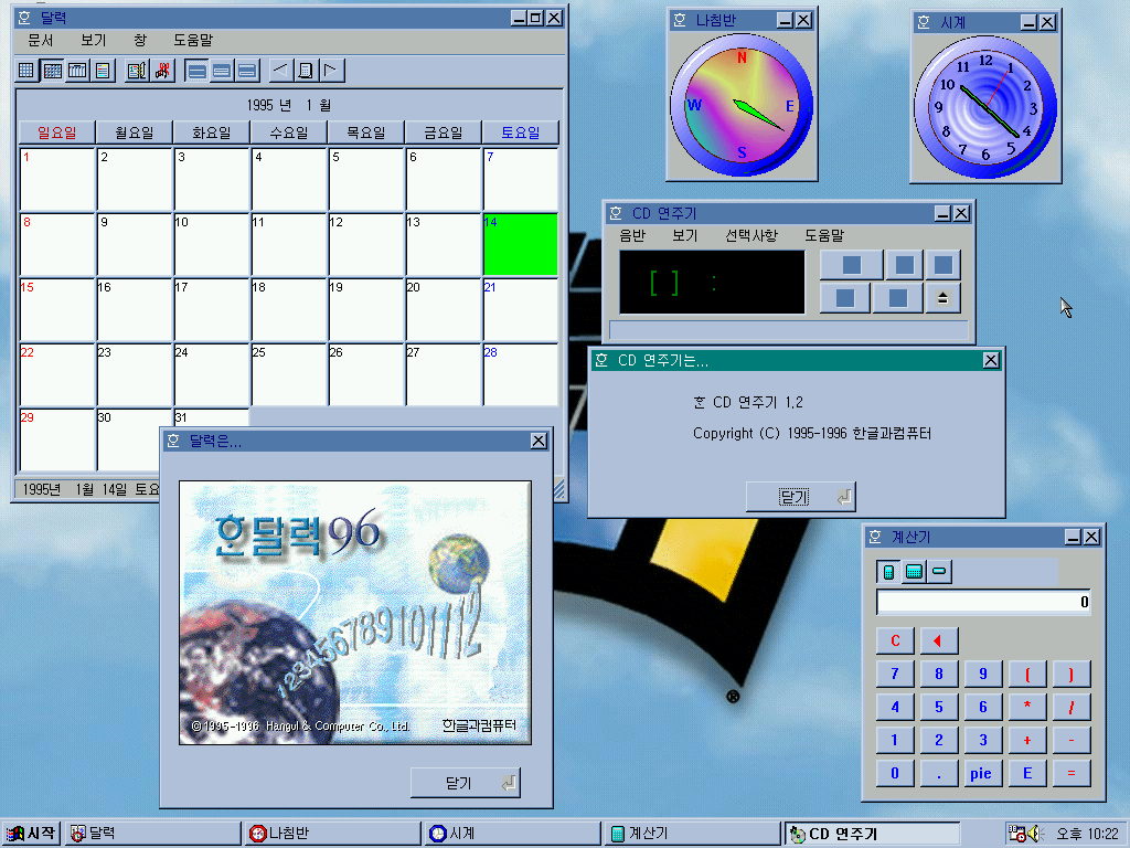 달력, 나침반, 시계, CD 연주기, 계산기입니다. 저 나침반은 실제 방향이 아닌 마우스 방향을 가리킵니다. CD 연주기 버전은 1.2입니다.