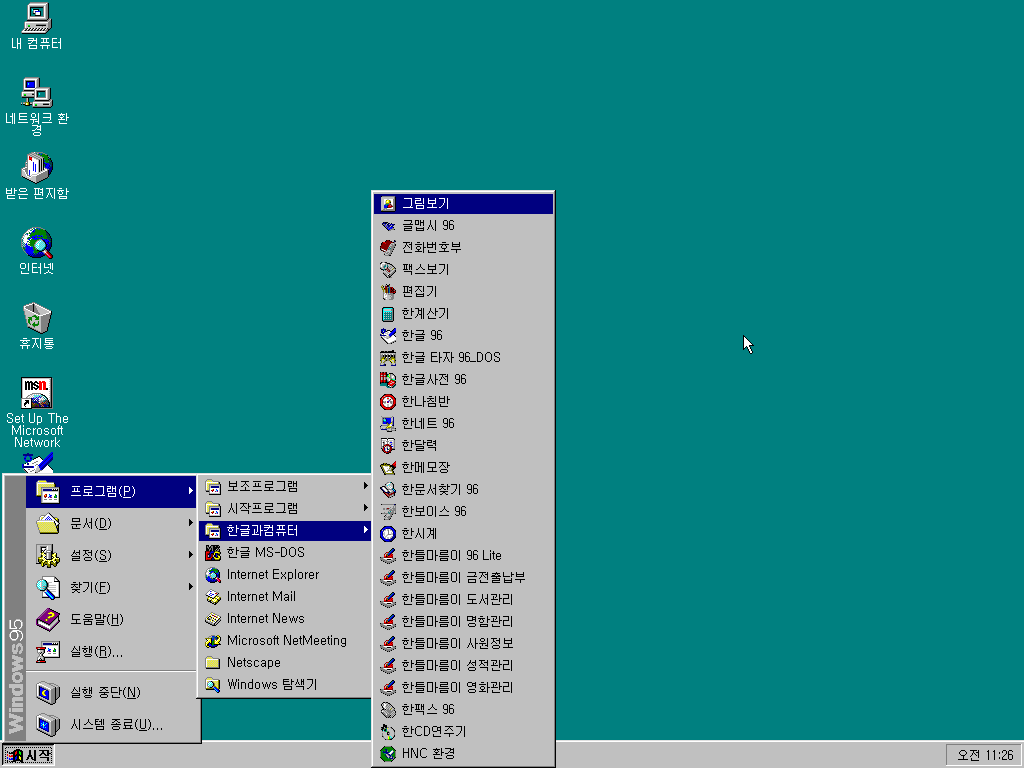 설치 후 한글과컴퓨터 항목을 열어보았습니다. 한글 96 외에도 그림보기, 글맵시, 전화번호부, 팩스보기, 편집기, 한계산기, 한글 타자, 한글사전, 한나침반, 한네트, 한달력, 한메모장, 한문서찾기, 한보이스, 한시계 한틀마름이, 한팩스, 한CD연주기.. 부가기능이 정말 많습니다. 한번도 안 쓸것 같은데 말이죠.