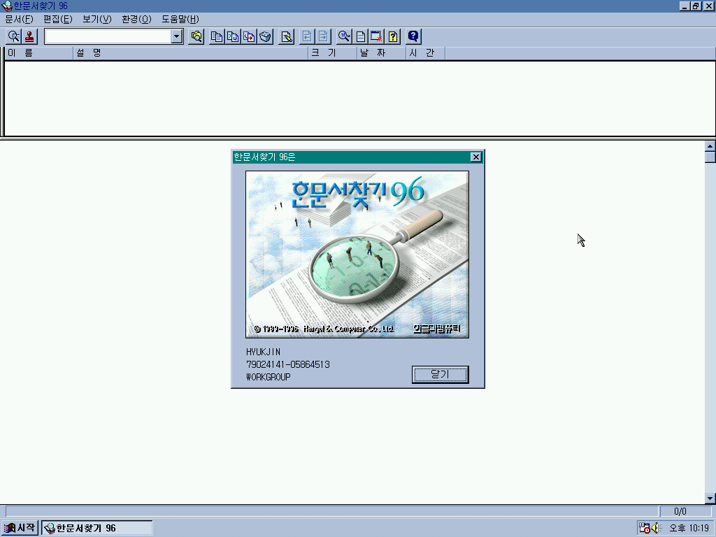 한글 정보입니다. 한글 96 평가판이라고 쓰여 있진 않지만, 안내문으로 보아 평가판임을 알 수 있습니다.