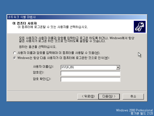 매번 이름과 암호를 입력해서 로그온할 건지, 아니면 한 사용자 계정으로 자동 로그온할건지 선택합니다.