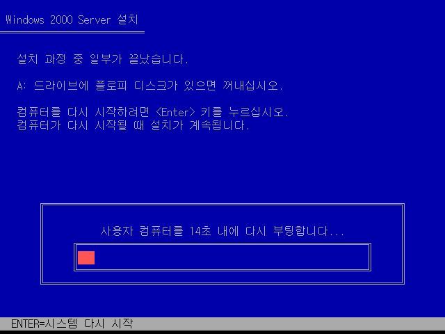 윈도우 2000의 설치가 끝났습니다. 재시작합니다.