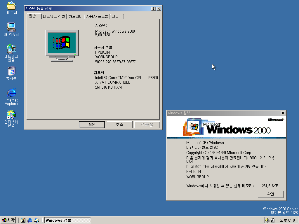 시스템 등록 정보입니다. 윈도우 2000이고, 빌드 넘버는 5.00.2128입니다. RC2 버전입니다.