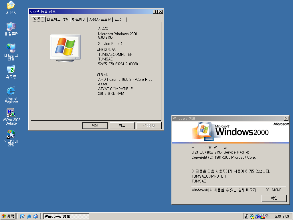 시스템 등록 정보입니다. 윈도우 XP처럼 꾸며놨지만 분명 윈도우 2000입니다. 서비스 팩 4 버전입니다.