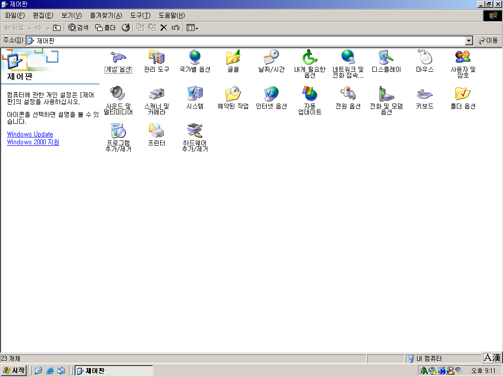 제어판입니다. 역시 모든 아이콘을 XP로 바꿔놓았습니다. 이쯤 되면 제가 2000을 쓰고 있는 건지 XP에 고전 테마를 씌워서 쓰고 있는 건지 헷갈리네요 ㅋㅋㅋㅋㅋ