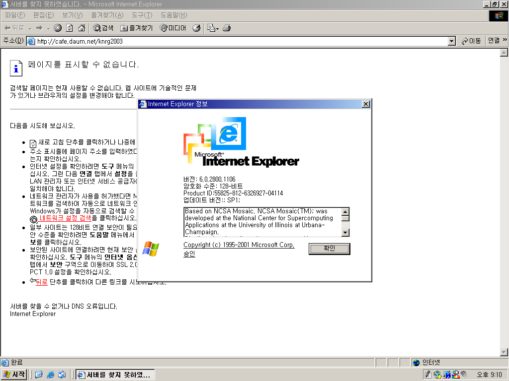 인터넷 익스플로러 6을 깔아놨습니다. 시작 페이지가 모 다음 카페네요. 아마 이 트윅 버전을 만든 사람이 활동하던 카페가 아닐까 싶습니다.