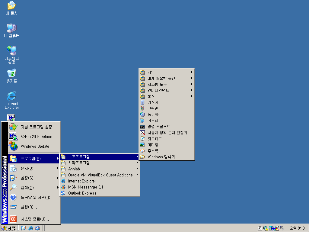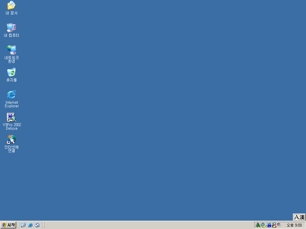 바탕화면입니다. 아쉽게도 윈도우 XP의 기본 바탕화면은 없었습니다. 아이콘들을 죄다 XP의 아이콘으로 바꿔놓았습니다. 인터넷 익스플로러 6가 깔려있고, 트레이 아이콘들을 보면 MSN 메신저와 V3가 깔려있습니다.