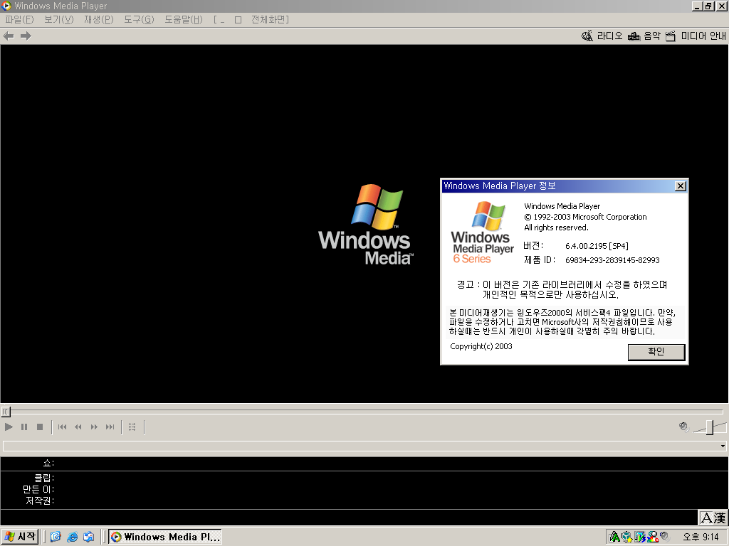 윈도우 미디어 플레이어입니다. 버전은 2000에 깔려있는 6.4가 맞지만, XP처럼 해놨습니다. 파일을 수정하거나 고치면 마이크로소프트사의 저작권을 침해하므로 사용할 때 각별히 주의를 요하는 문구가 보이네요 ㅋㅋㅋㅋㅋ 정작 XP 에디션을 만든 본인부터 파일을 고쳤는데 말이죠.