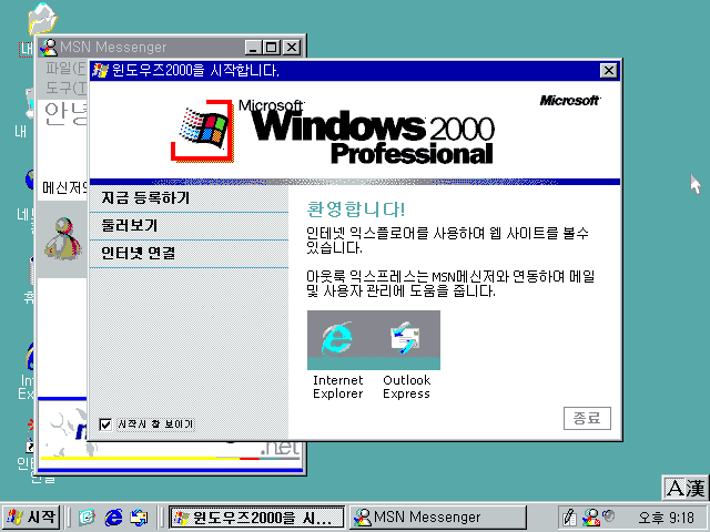 설치가 끝났습니다. 안내창에 '윈도우즈2000을 시작합니다.' 라고 한글로 써놨네요 ㅋㅋㅋ 뒤에 보니 MSN 메신저도 깔린 모습입니다.