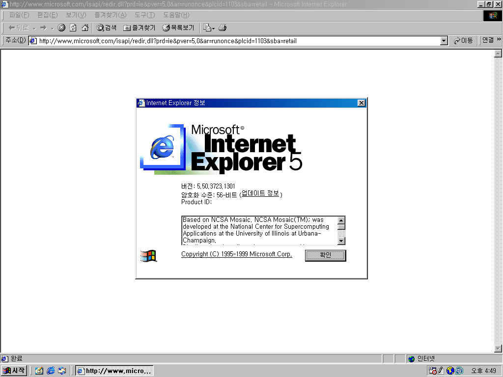 인터넷 익스플로러입니다. 버전 5.5이고, 빌드 넘버는 5.50.3723.1301입니다. IE 5.5 디벨로퍼 프리뷰의 빌드보다 더 앞선 버전입니다. 아마 자체 내장 버전인 듯 합니다.