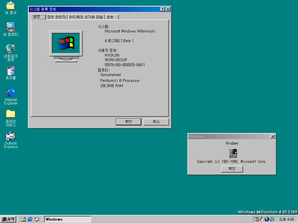 시스템 등록 정보입니다. 윈도우 밀레니엄 베타 1이고, 빌드 넘버는 4.90.2380입니다. 옆에 winver 창엔 그냥 Windows라고만 나오네요 ㅋㅋ