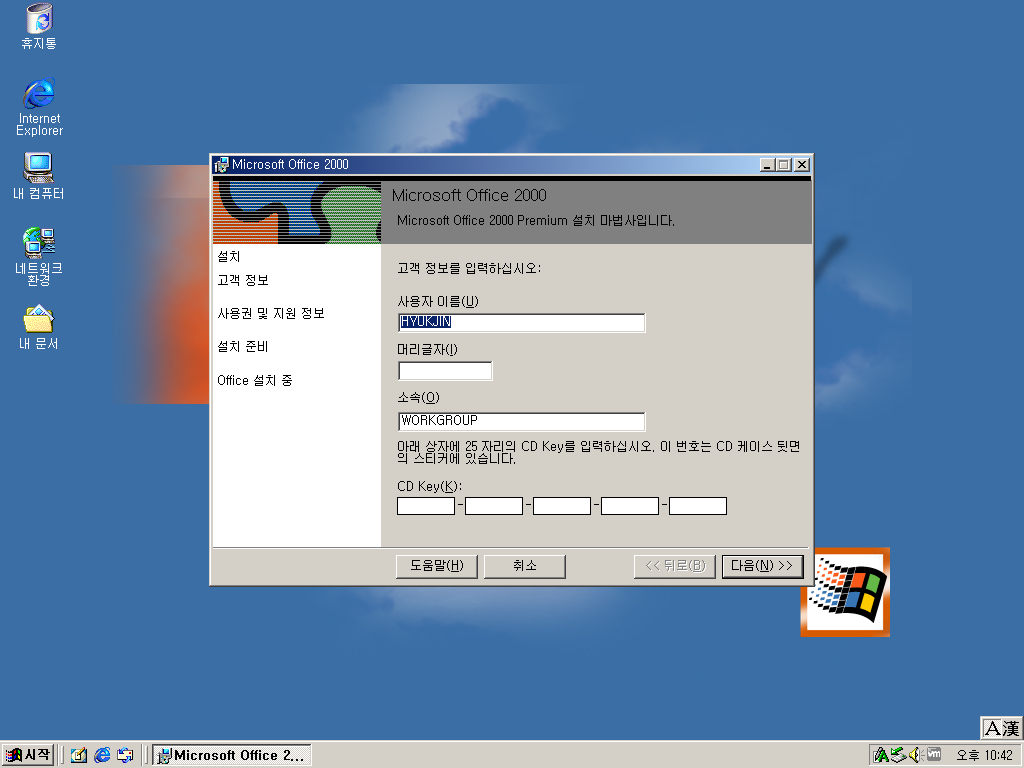 윈도우 2000에서 설치했습니다. 설치 CD를 넣으니 오토런으로 설치가 실행됩니다. MS 오피스 2000 프리미엄 버전을 설치했습니다. 사용자 이름과 소속, 그리고 CD 키를 입력합니다.