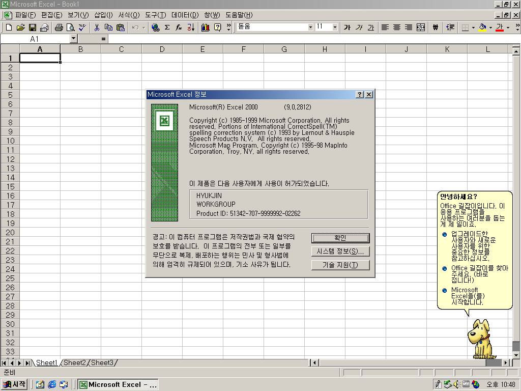 엑셀 정보입니다. 버전 2000에 9.0입니다. 빌드 넘버는 9.0.2812입니다.