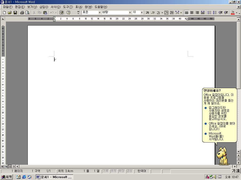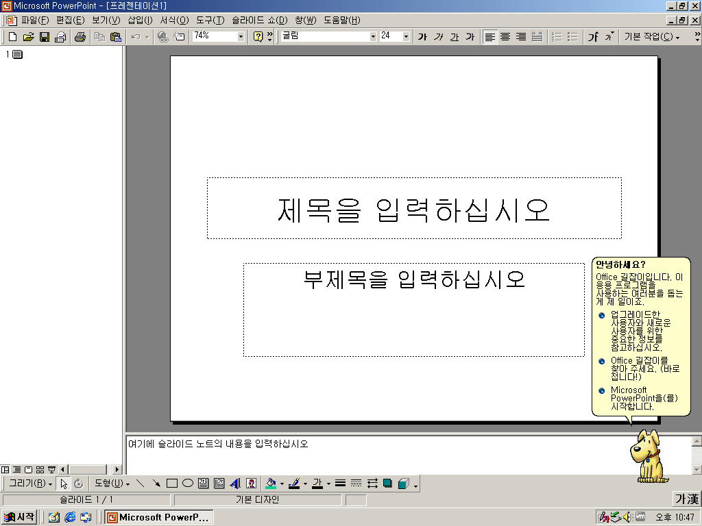 파워포인트의 모습입니다. 제가 어렸을때 써본 버전이라 그런지 익숙하네요. 옆에 저 쓸모없는 길잡이 강아지도 있습니다.
