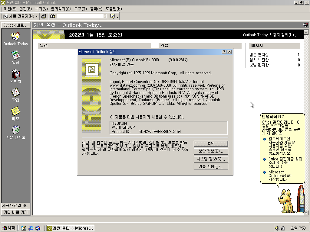 아웃룩 정보입니다. 버전 2000에 9.0입니다. 빌드 넘버는 9.0.2814입니다.