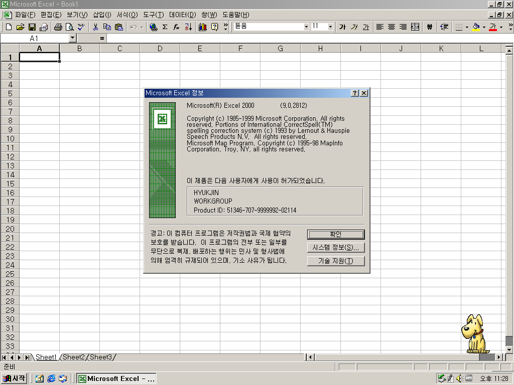 엑셀 정보입니다. 버전 2000이고, 9.0입니다. 빌드 넘버는 9.0.2812입니다.