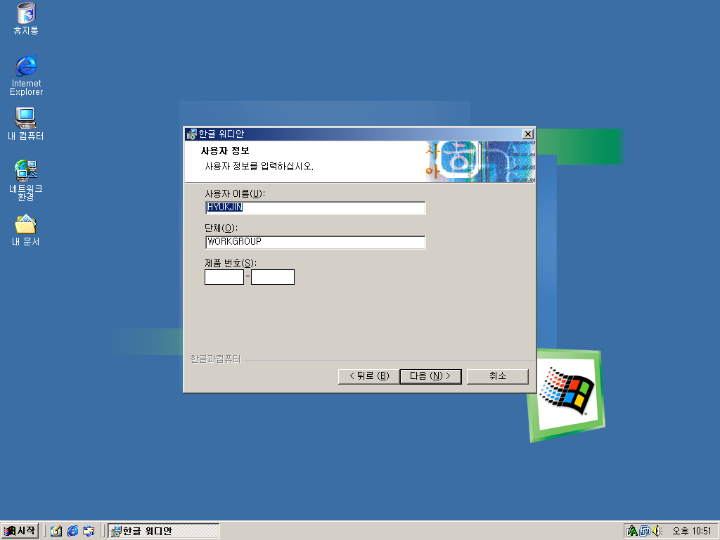 사용자 이름과 단체명은 기존 컴퓨터의 정보가 입력되어 있습니다. 제품 번호를 입력해줍니다.
