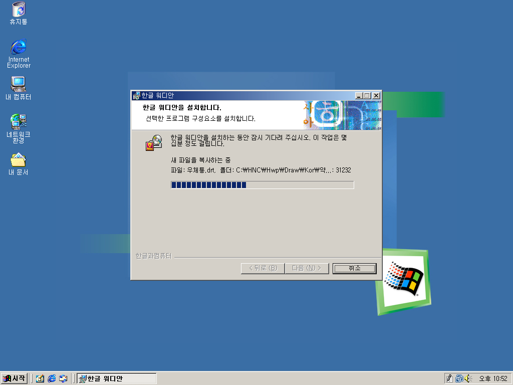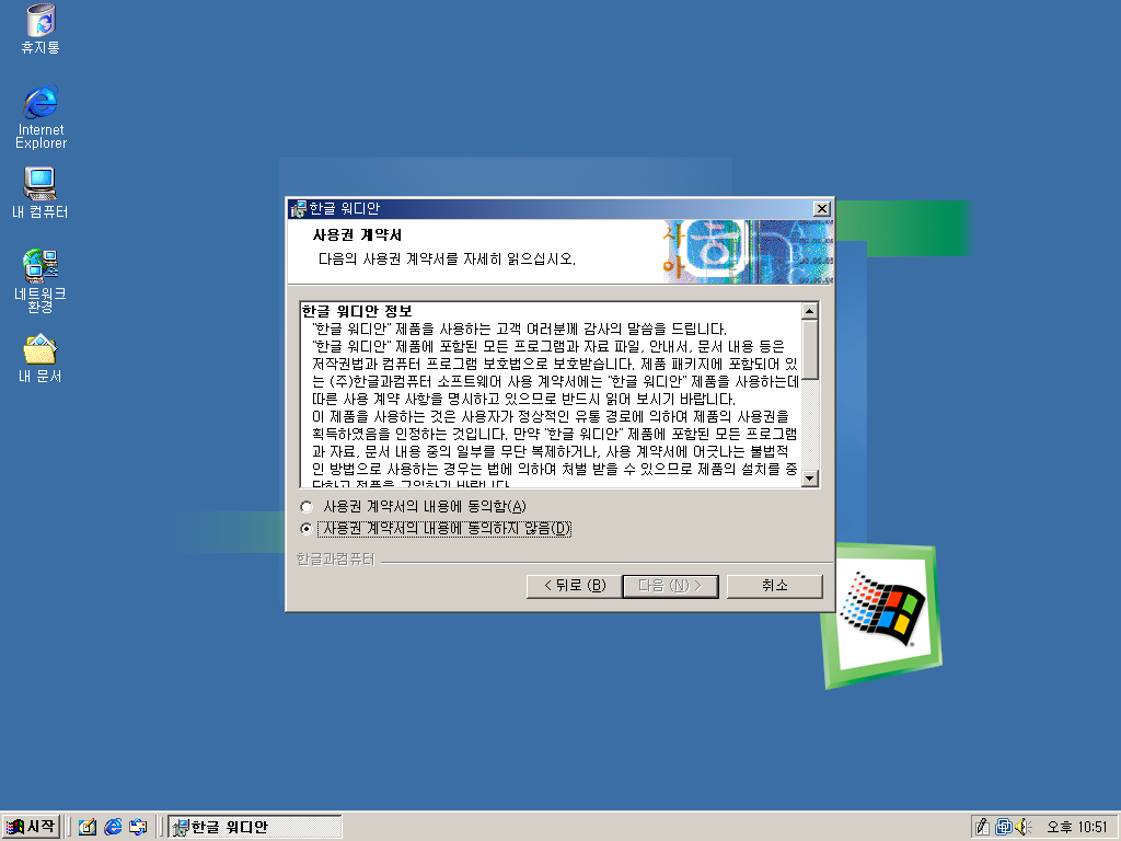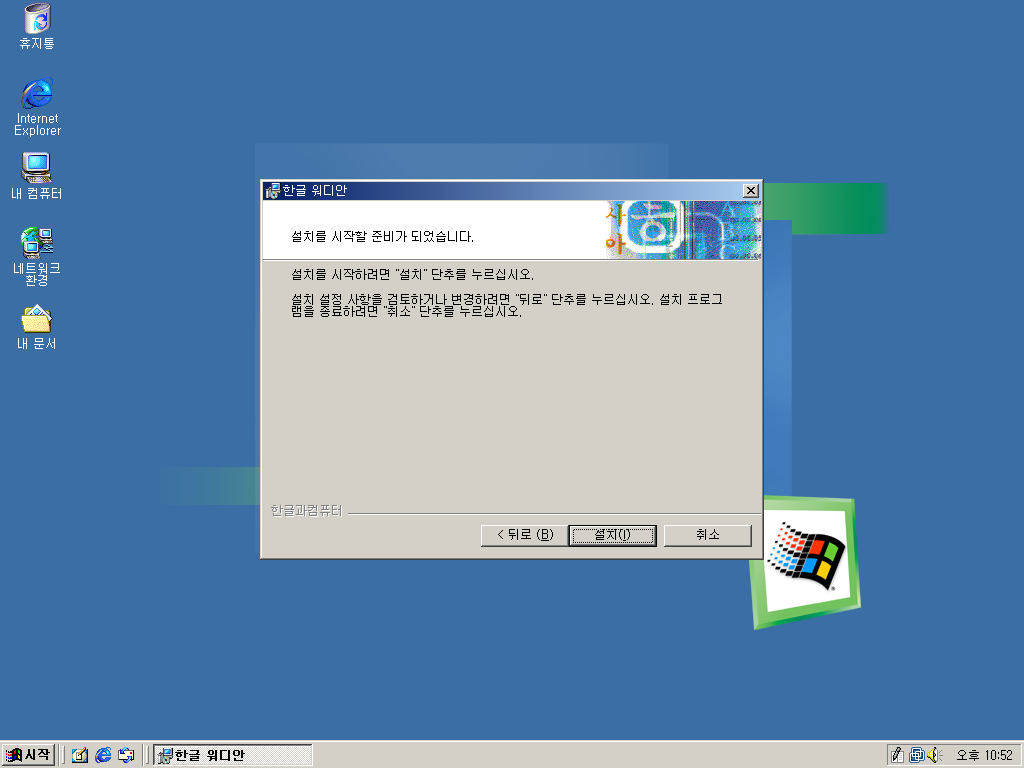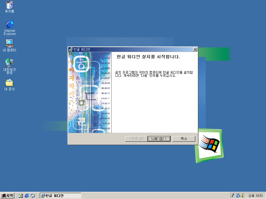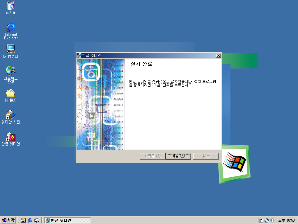 한글과컴퓨터 한글 워디안을 설치해보았습니다. 한글 워디안은 아래아 한글 제품 중 최악의 망작이라고 평가받는 제품입니다. 워낙 어려웠던 IMF 시기에 개발된 물건이다보니 버그가 미처 다 수정되지 못한 상태로 시중에 나왔기 때문입니다. 수많은 버그와 호환성 문제로 결국 한글과컴퓨터는 엄청난 욕을 먹고 공을 들여 수작인 한글 2002를 내놓습니다. 워디안 사용자들은 무상 업그레이드가 가능했죠. 공교롭게도 비슷한 시기에 나온 윈도우 Me도 비슷한 이유로 최악의 윈도우라고 평가받는데, 워디안은 아래아 한글계의 윈도우 Me라고 불렸습니다. 그래서 왠지 워디안은 Me에 깔아야 할 것 같아서 윈도우 Me에 깔아보았습니다.