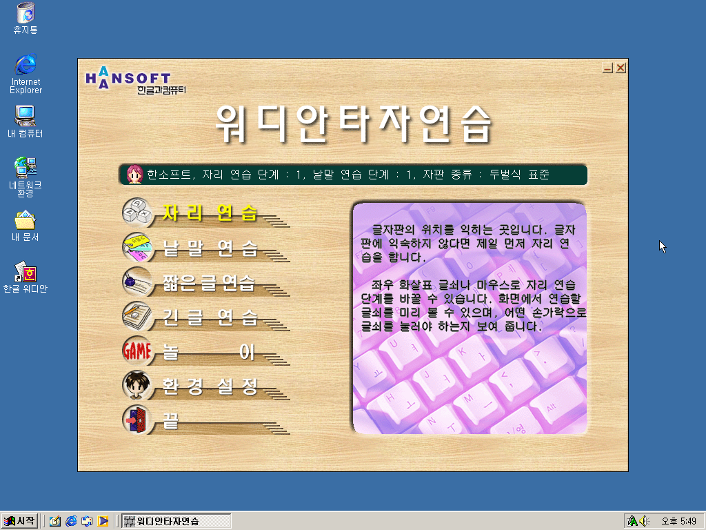 워디안 타자연습입니다. 한글 2007까지 쓰였던 한컴타자연습 버전이 워디안부터 사용되던 것이었군요. 저는 한글 2002와 2005를 가장 많이 사용해서 이 버전의 타자연습이 가장 익숙합니다.