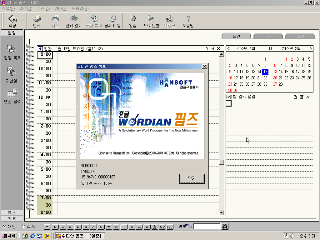 워디안 핌즈의 모습입니다. 일정 관리 프로그램 같습니다. 버전은 1.1판입니다.
