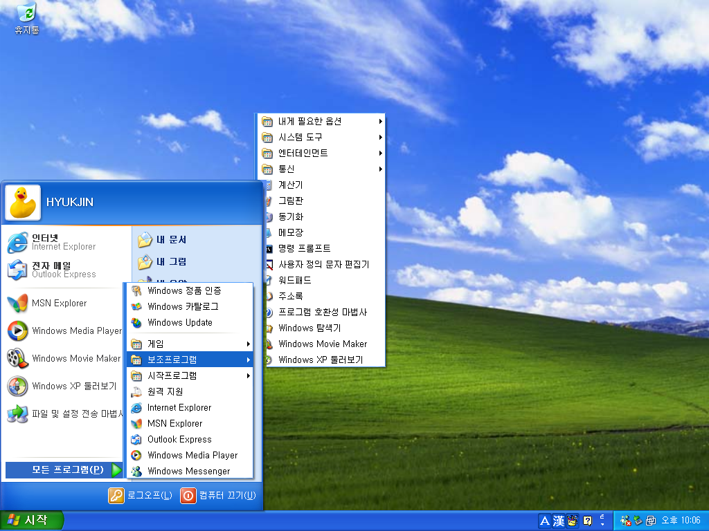 윈도우 XP 홈 에디션의 모습입니다. 익숙한 바탕화면입니다.
