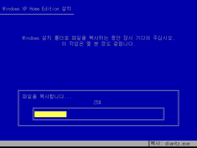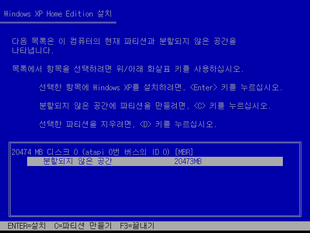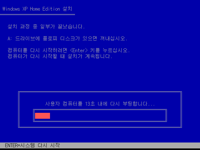 윈도우 XP 홈 에디션 설치를 시작합니다. 엔터를 누릅니다.