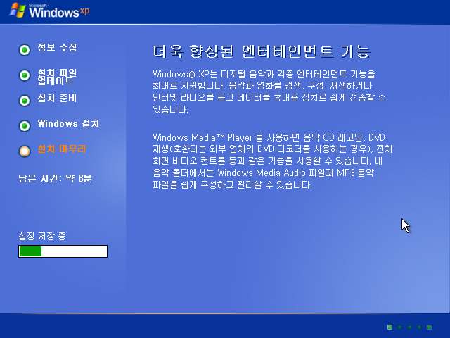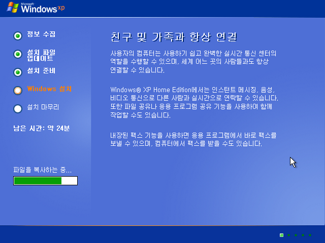 부팅화면입니다. 프로페셔널과 달리 지렁이가 초록색입니다. 얘도 서비스 팩 1까지만 이렇고, 서비스팩 2부터는 홈 에디션 문구가 사라지고 지렁이도 프로페셔널처럼 파란색으로 바뀝니다.