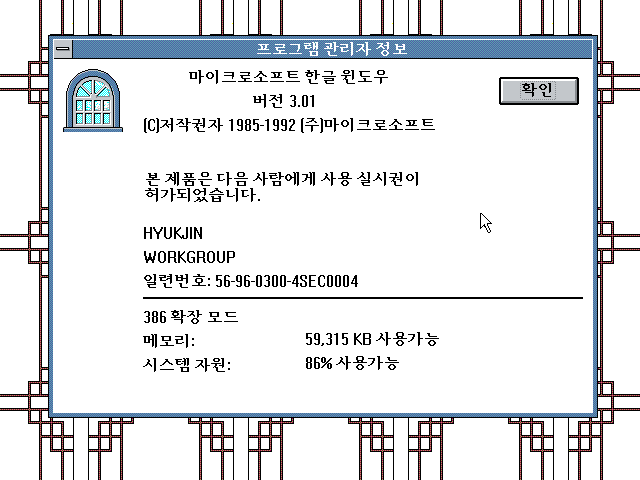Windows 3.01 한글판입니다. 3.5인치 1.44MB 디스크 10장입니다. 1~5번까지 설치디스크이고 6~10번은 외곽선 글꼴 파일들입니다. 참고로 얘도 마찬가지로 3번 디스크에 사용자명과 회사명이 기록되기 때문에 새로 설치하고 싶으시면 3번 디스크는 백업하시기 바랍니다.