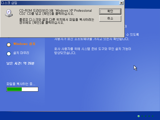 그러면 파일 복사를 하다가 다시 원래 1번 CD를 넣으라고 합니다. 넣어줍니다.