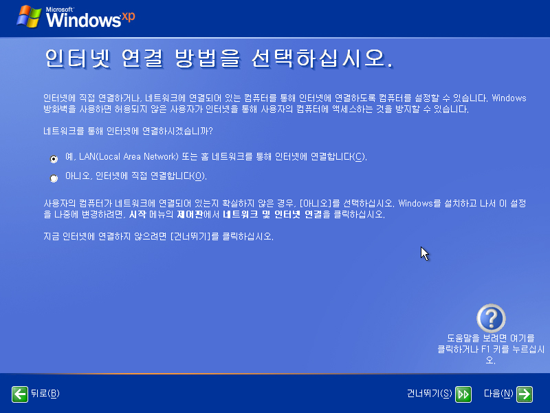 인터넷 연결 방법을 선택합니다. LAN으로 연결하기를 선택합니다.