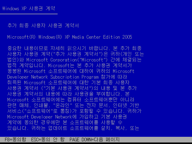 그래도 이전의 MCE나 TPC 에디션들이 사용권 계약서에서까지 프로페셔널로 나오는 데 비해, MCE 2005는 계약서에는 MCE라고 나옵니다. F8을 누릅니다.