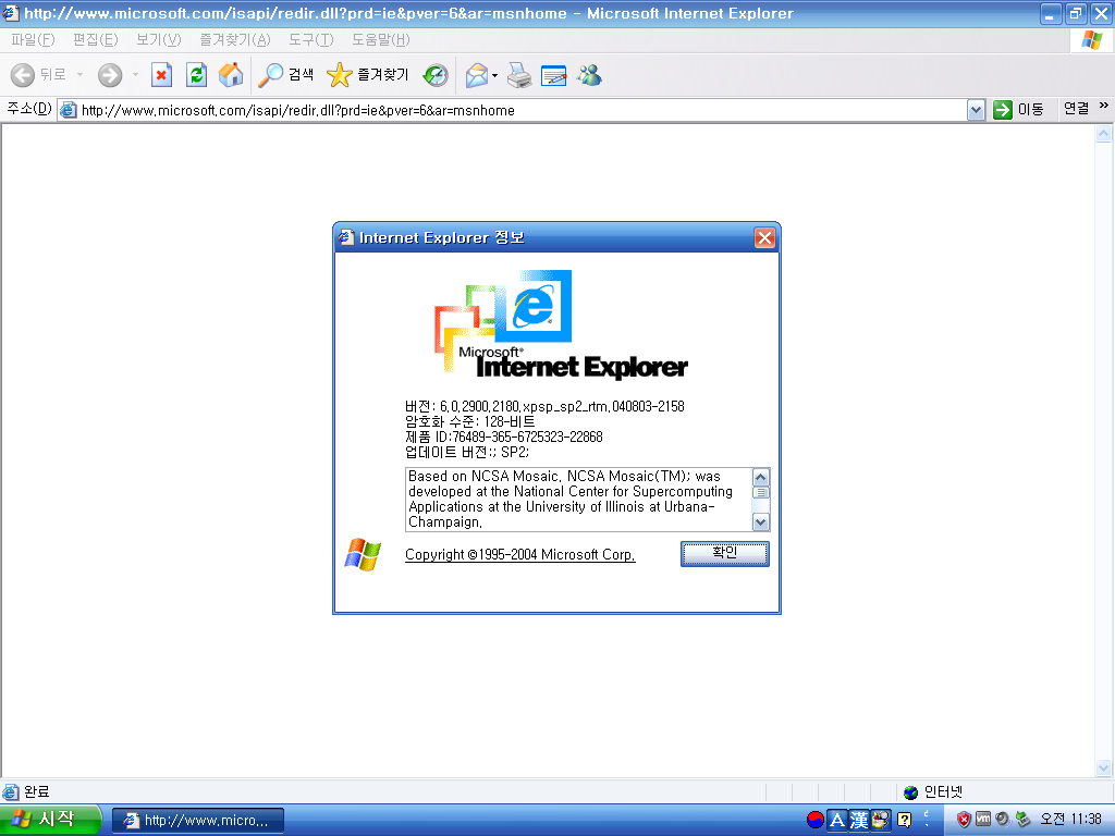 인터넷 익스플로러입니다. 버전 6.0 서비스 팩 2이고, 빌드 넘버는 6.0.2900.2180입니다. 윈도우 XP는 IE 8까지 지원합니다.